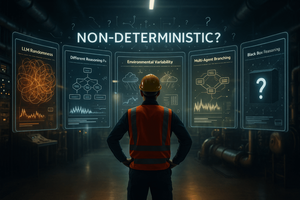 When multiple agents collaborate (say, optimizing energy use across a plant or coordinating maintenance schedules across a fleet), they may negotiate different solutions depending on timing, priority conflicts, and resource availability. This can look non-deterministic from the outside.