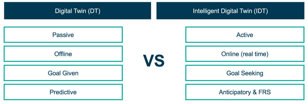 The Intelligent Digital Twin (IDT) is an advanced version of the traditional digital twin, which has been largely passive in nature. IDTs are characterized by their active, online, goal-seeking, and anticipatory nature. They are designed to assist and augment human intelligence, rather than replace it.