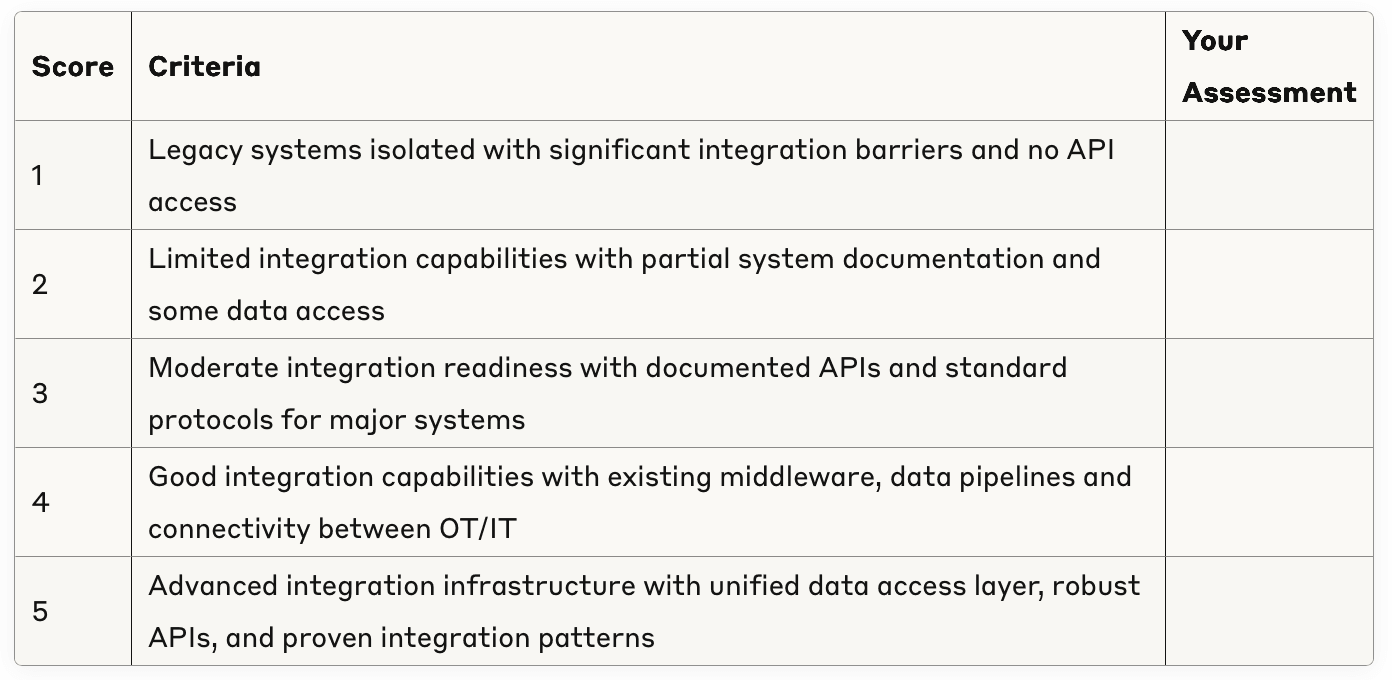 Data integration forms the foundation of effective AI implementation. Agents need reliable, timely access to operational data from diverse sources to make informed decisions. You must understand how the proposed agentic AI solution will access and process data from disparate systems. This becomes especially crucial when dealing with proprietary protocols or legacy systems with limited connectivity.