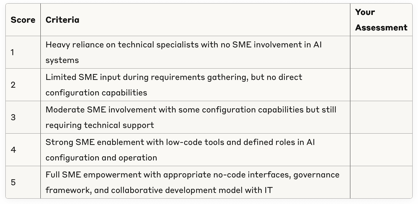 6. Will our subject matter experts be empowered to configure and guide these AI systems, or will we create new technical dependencies?