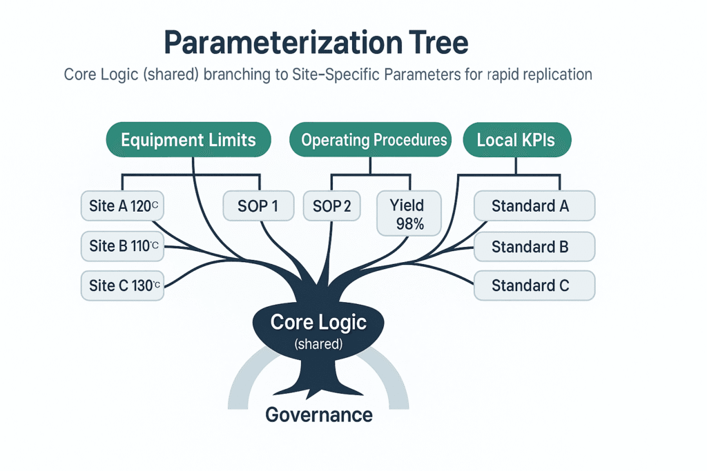 Package logic once. Vary only site parameters: tag maps, units, limits, calendars, policies, and integrations. Deploy by configuration, not code.