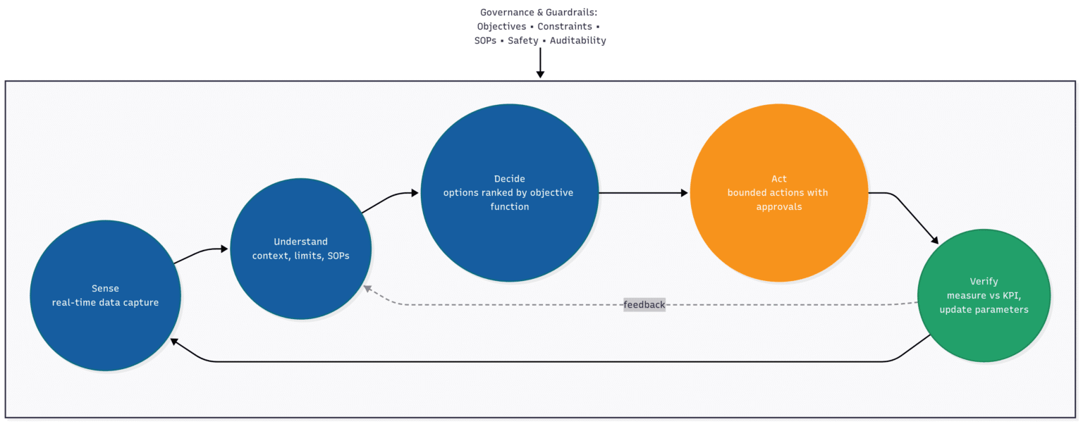 TL;DR: Industrial AI works when it closes the loop: sense, understand, decide, act, verify. Govern decisions with objective functions tied to finance-visible KPIs. Parameterize what changes by site so you deploy by configuration, not code. Progress from support to augmentation to bounded automation with clear guardrails.